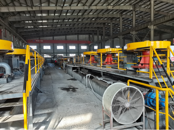 浮選工藝采用的是鉛鋅優先浮選,鉛粗精礦再磨工藝。鉛系統和鋅系統浮選流程均為一粗三掃四精,并鉛粗精礦再磨至-325目92%。浮選機均采用先進的充氣攪拌式浮選機,浮選機轉速低,磨損小,電機能耗少,環保節能。浮選自動化程度高,配備浮選中央控制室。浮選機均安裝自動化液面控制系統,根據泡沫層厚度,設定的液面高度,能自動調節閘門開關大小,有利于浮選液面的穩定。浮選加藥系統采用北礦院生產的自動加藥機,加藥閥門均采用氣動控制,加藥穩定,加藥量精準。浮選系統中有在線品位檢測系統,能實時監控原礦品位、鉛鋅精礦品位、尾礦品位等,對生產的穩定有著良好的現場使用效果。