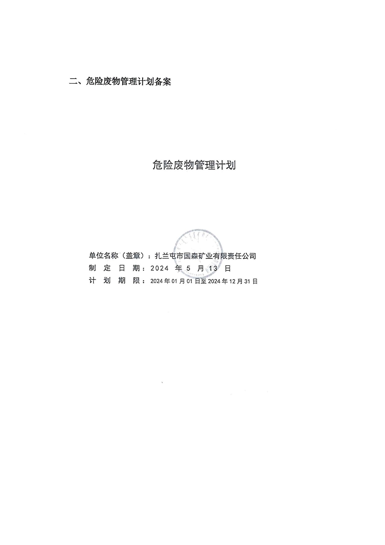 扎蘭屯市國森礦業有限責任公司危險廢物管理信息公開