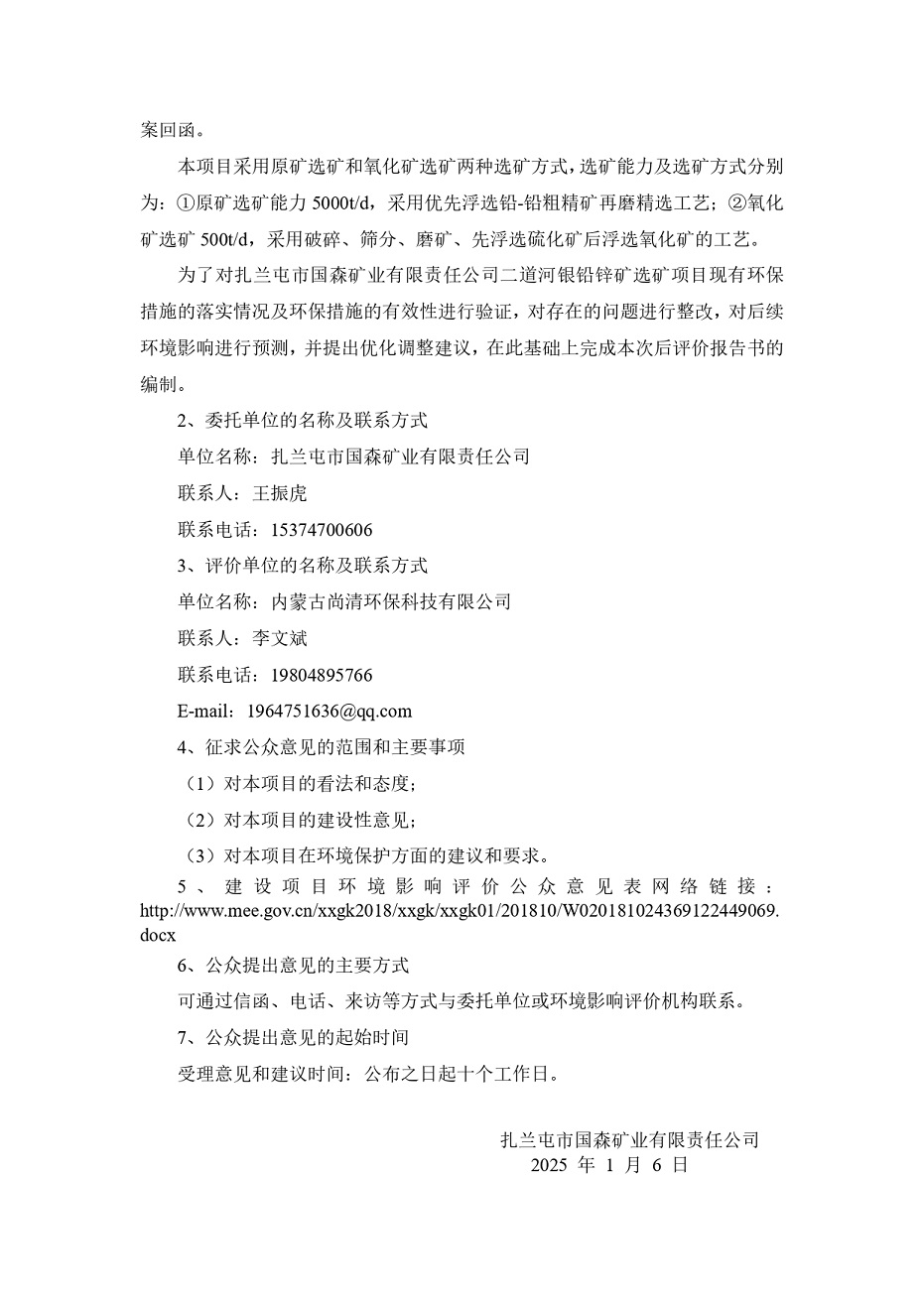 《扎蘭屯市國森礦業(yè)有限責(zé)任公司二道河銀鉛鋅礦選礦工程環(huán)境影響后評價報告書》公眾參與第一次公示